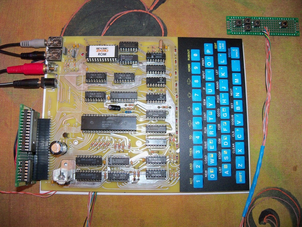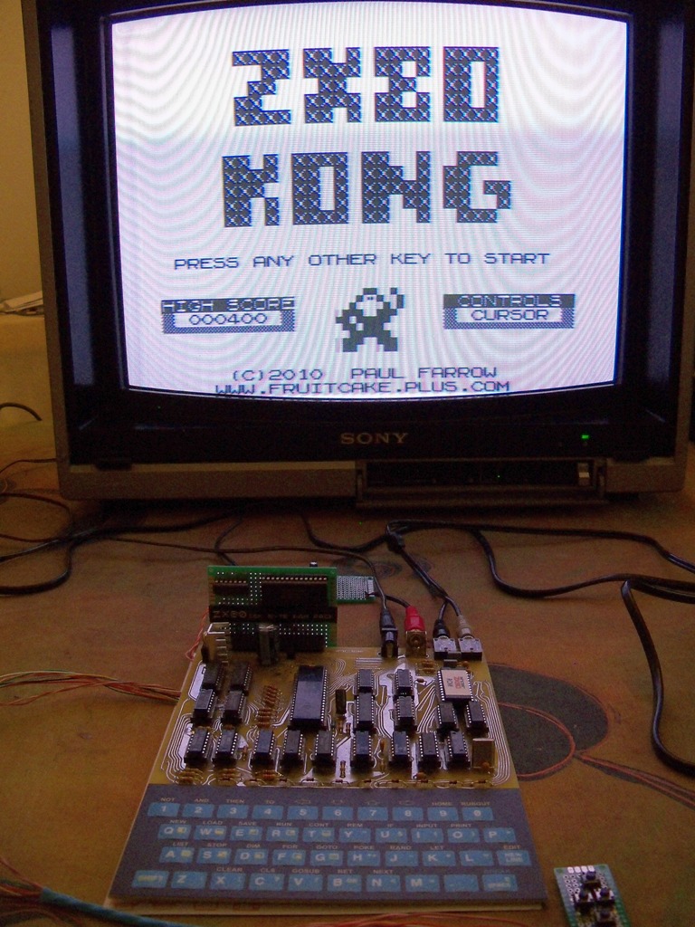 Inside the original ZX80 (left) and my build (right) right-click open in new TAB for full resolution original ZX80 board photo by Grant Searle Modern Replica - Second Build I built a second copy of the ZX80 from separate components I purchased. This board follows the original 1980 PCB layout more faithfully. Consequently, an adapter is needed for the 2732 EPROM to adapt it to the mask ROM expected by the motherboard. The keyboard membrane is smooth and shiny, which I quite like. It also replicates the original look more closely. ZX80 KONG and Pacman available here. Video Output Modifications